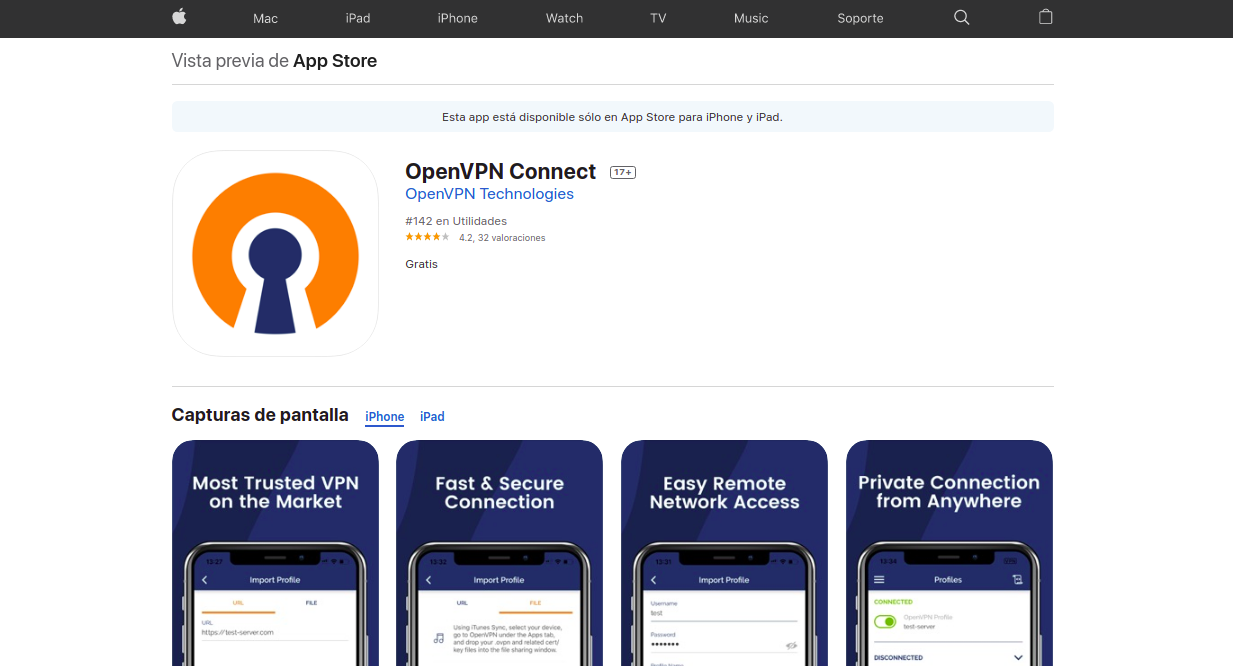 Para dispositivos con SO IOS puede obtenerse a través de https://apps.apple.com/mx/app/openvpn-connect/id590379981#?platform=iphone, en sus diferentes versiones para ipad o iphone.