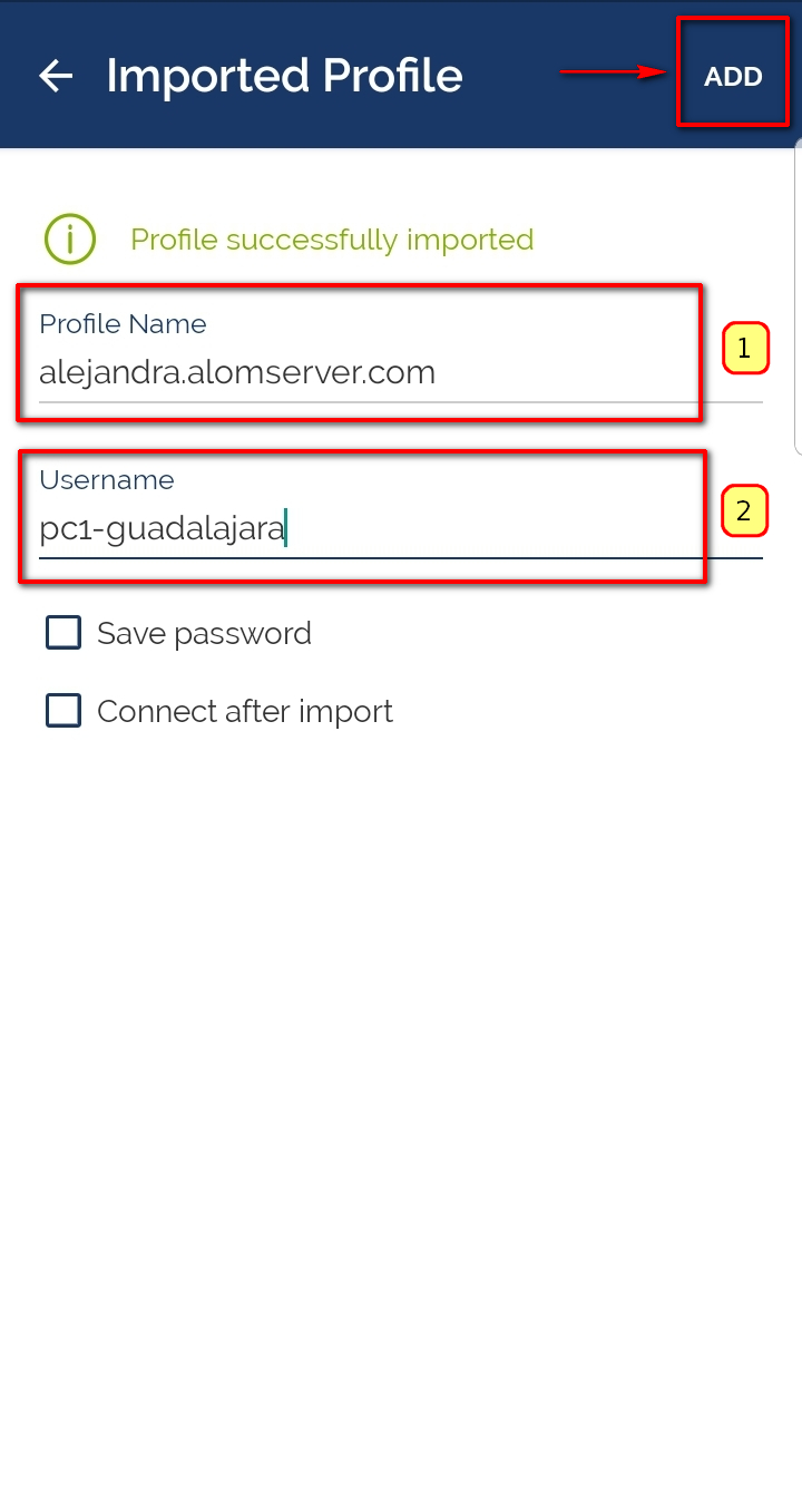 3 Una vez que el archivo sea cargado, nombramos la conexión y agregamos el nombre de usuario, el nombre de conexión puede ser su nombre de usuario o el nombre de dominio de la vpn, en nuestro caso lo nombraremos como alejandra.alomserver.com.