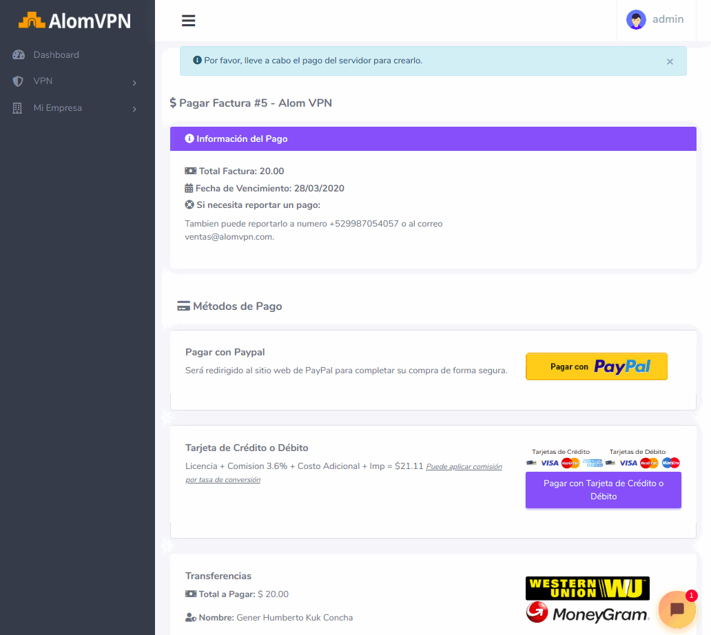 2Le mostrara las opciones de pago ya sea por medio de Transferencia Bancaria, Paypal, entre otras más. Dar click en el boton pagar y le redigira a la ventana de pago.