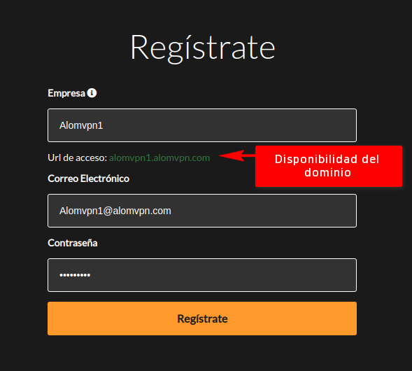 2Seguidamente debemos completarlo con un nombre para su empresa, un correo electrónico valido y una contraseña, como se muestra en este ejemplo para después seleccionar la opción "Registrate".